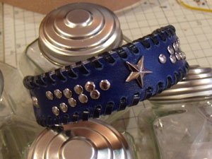 ベースにナチュラルヌメ、トップは青のドラムダイ 星カシメと極小カシメで飾り紺色の牛革レース網み 小型犬用 製作時間3時間 製作予算約8000円前後 |